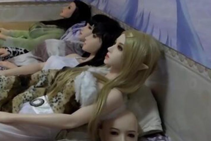 Silikondan yapılma 7 şişme kadınla aynı evi paylaşan baba oğul Yangyang’da yaşıyor.
