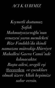 Ece Erken’in paylaşımında, “Şafak Mahmutyazıcıoğlu’nun cenazesi yarın Rize Fındıklı’da ikindi namazını müteakip, Hürriyet Mahallesi Gavra Camii’nde kılınacaktır.” ifadelerine yer verildi.